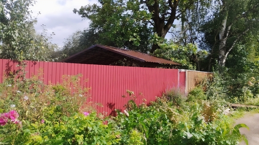 Навес двускатный из коричневого профнастила для зоны отдыха на даче Арт-696